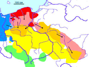 Scholars generally locate Gothiscandza in the area of the Wielbark culture.[55][56][57] This culture emerged in the lower Vistula and along the Pomeranian coast in the 1st century AD, replacing the preceding Oksywie culture.[58] It is primarily distinguished from the Oksywie by the practice of inhumation, the absence of weapons in graves, and the presence of stone circles.[59][60] This area had been intimately connected with Scandinavia since the time of the Nordic Bronze Age and the Lusatian culture.[51] Its inhabitants in the Wielbark period are usually thought to have been Germanic peoples, such as the Goths and Rugii.[1][61][62][63][64] Jordanes writes that the Goths, soon after settling Gothiscandza, seized the lands of the Ulmerugi (Rugii).[65][66]
