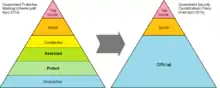 The GSCP uses three levels of classification: OFFICIAL, SECRET and TOP SECRET.[2] This is simpler than the old model and there is no direct relationship between the old and new classifications. "Unclassified" is deliberately omitted from the new model. Government bodies are not expected to automatically remark existing data, so there may be cases where organisations working under the new system still handle some data marked according to the old system.
