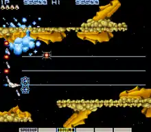 The player controls the trans-dimensional spaceship Vic Viper and must battle waves of enemies through various environments.[7] The game became synonymous with the phrase, "Destroy the core!", as the standard of boss battles in the Gradius series involved combat with a giant craft, in the center of which would be situated one to several blue colored spheres. These bosses would be designed in such a way that there would be a straight passage from the exterior of the giant craft which leads directly to one of these cores. The player must fire shots into this passage while avoiding attack patterns from weapon emplacements on the body of the boss. However, small but destructible walls are situated in this passage, impeding the bullet shots from damaging the core, and must be whittled away by repeated well-placed shots. In a way, these tiny walls represent the boss' shielding gauge until its core is finally vulnerable to attack. Some bosses can regenerate these walls. When the core has sustained enough hits, it usually changes color from blue to red, indicating that it is in critical condition and its destruction is imminent. Upon the destruction of a core, a piece of the boss may be put out of commission, seeing that it is no longer powered by a core, or if all of the cores are destroyed, the entire boss is defeated and explodes satisfyingly. Note that these cores are not present on the more organic bosses of Gradius. Such bosses have weak spots in places such as a mouth, head or eye.