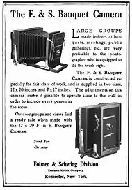 William F. Folmer, an inventor, co-owned the Folmer and Schwing Manufacturing Company, founded in New York City as a gas lamp company. As the gas lamp market declined, the company expanded into other areas including bicycles and photographic equipment, leading to the release of the first Graflex camera in 1899.[2] As the company's success grew, it chose to focus on photography and dropped its other manufacturing lines, and in 1905 was acquired by George Eastman, in 1907 becoming the Folmer Graflex Division of Eastman Kodak. After a succession of name changes, it finally became simply "Graflex, Inc." in 1945.[3] Eastman Kodak made all of the Graflex cameras in their professional equipment manufacturing plant on Clarrisa street in Rochester NY. In 1926, as a result of violations of the Sherman Anti-Trust Act (Comp. St. § 8820 et seq.) Kodak was forced to divest itself of its professional equipment division, which became Graflex Inc. This company existed under independent ownership until 1958, when the company was bought by the General Precision Equipment, which operated it as an independent division until 1968, when it was sold to the Singer Corporation, who also operated it as a division until 1973, when it was finally wrapped up and its tooling sold to the Toyo Corporation.[2][4]