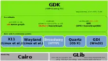 The Graphics Device Interface (GDI) is a legacy component of Microsoft Windows responsible for representing graphical objects and transmitting them to output devices such as monitors and printers. It was superseded by DirectDraw API and later Direct2D API. Windows apps use Windows API to interact with GDI, for such tasks as drawing lines and curves, rendering fonts, and handling palettes. The Windows USER subsystem uses GDI to render such UI elements as window frames and menus. Other systems have components that are similar to GDI; for example: Mac OS has QuickDraw, and Linux and Unix have X Window System core protocol.