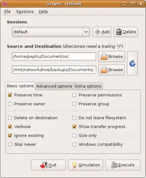 Grsync is a graphical user interface for rsync.[2] rsync is a differential backup and file synchronization tool widely used in Unix-like operating systems.
