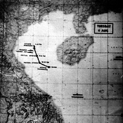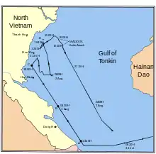 By August 1, North Vietnamese patrol boats were tracking Maddox, and several intercepted communications indicated that they were preparing to attack.[7] Maddox retreated, but the next day, August 2, Maddox, which had a top speed of 28 knots, resumed her routine patrol, and three North Vietnamese P-4 torpedo boats with a top speed of 50 knots began to follow Maddox.[7] The boats were from Squadron 135, commanded by Le Duy Khoai, with the boats commanded by brothers Van Bot, Van Tu, and Van Gian.[7] Intercepted communications indicated that the vessels intended to attack Maddox.[7] As the ships approached from the southwest, Maddox changed course from northeasterly to southeasterly and increased speed to 25 knots.[7]