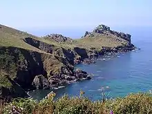 The headland is the site of an Iron Age promontory fort known as Trereen Dinas[5] (not to be confused with Treryn Dinas). On the cliff-edge, above Treen Cove are the remains of Chapel Jane, which could have been a guild chapel of local fisherman. The earliest pottery dates from AD 1100 to 1150, but the original simple structure of the chapel is comparable with the tiny chapels of St Helen's and Teän, on the Isles of Scilly. An association with the adjoining stream which according to local, 19th-century, tradition was regarded as a holy well, could indicate an earlier, possibly 8th-century founding.[6]
