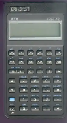 The HP-27S was a pocket calculator produced by Hewlett-Packard, introduced in 1988, and discontinued between 1990 and 1993 (sources vary). It was the first HP scientific calculator to use algebraic entry instead of RPN, and though it was labelled scientific, it also included features associated with specialized business calculators.