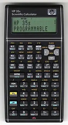 The HP 35s (F2215A) is a Hewlett-Packard non-graphing programmable scientific calculator. Although it is a successor to the HP 33s, it was introduced to commemorate the 35th anniversary of the HP-35, Hewlett-Packard's first pocket calculator (and the world's first pocket scientific calculator). HP also released a limited production anniversary edition with shiny black overlay and engraving "Celebrating 35 years".[2]