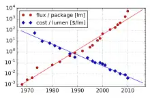 Haitz's law is named after Roland Haitz (1935–2015),[2] a scientist at Agilent Technologies among others. It was first presented to the larger public at Strategies in Light 2000, the first of a series of annual conferences organized by Strategies Unlimited.[3] Besides the forecast of exponential development of cost per lumen and amount of light per package, the publication also forecast that the luminous efficacy of LED-based lighting could reach 200 lm/W (lumen per watt) in 2020, crossing 100 lm/W in 2010. This would be the case if enough industrial and government resources were spent for research on LED-lighting. More than 50% of the electricity consumption for lighting (20% of the totally consumed electrical energy) would be saved reaching 200 lm/W. This prospect and other stepping-stone applications of LEDs (e.g. mobile phone flash and LCD-backlighting) led to a massive investment in LED-research so that the LED efficacy did indeed cross 100 lm/W in 2010. If this trend continues, LEDs will become the most efficient light source by 2020.