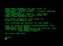 Hamurabi is a text-based strategy video game centered on resource management in which the player, identified in the text as the ancient Babylonian king Hammurabi, enters numbers in response to questions posed by the game. The resources that the player must manage are people, acres of land, and bushels of grain. These are managed over the course of ten rounds, each of which represents a year. Each person can farm a set amount of land, which produces grain. Grain, in turn, can be used to feed people, who otherwise die the following round, or planted for the following year's crop. The player may also buy or sell land to their neighbors each turn in exchange for grain. Each round begins with an adviser stating "Hamurabi: I beg to report to you" the current status of the city, including the prior year's harvest and change in population, followed by a series of questions as to how many bushels of grain to spend on land, seeds, and feeding the people.[1][2]