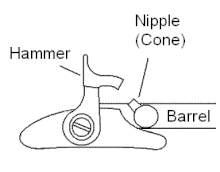 The caplock mechanism consists of a hammer, similar to the hammer used in a flintlock, and a nipple (sometimes referred to as a "cone"), which holds a small percussion cap. The nipple contains a tube that goes into the barrel. The percussion cap contains a chemical compound called mercury fulminate or fulminate of mercury, the chemical formula of which is Hg(ONC)2.[20] It is made from mercury, nitric acid, and alcohol. When the trigger releases the hammer, it strikes the cap, causing the mercuric fulminate to explode. The flames from this explosion travel down the tube in the nipple and enter the barrel, where they ignite the main powder charge.[20]