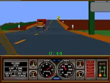 Hard Drivin' is a sim racing arcade video game developed by Atari Games in 1989.[5] Players test drive a sports car on courses that emphasize stunts and speed. It features one of the first 3D polygon driving environments[6] via a simulator cabinet with a haptic vibrating steering wheel and a custom rendering architecture.[7]