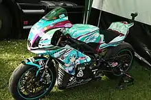 Studie with TeamUKYO's sponsorship continued with the 2013 season. The Racing Miku design for the season was done by Mari Shimazaki.[43][44] The illustrator of the official art was Saitom.[45] Sena Kougami returned as a racing queen for this season and was joined by Tsukasa Arai and Elena Ishiguro.[46] In 2013, the sponsorship expanded to feature a team in the Isle of Man TT, called Team Mirai, with a Racing Miku-designed bike. They finished 6th with Ian Lougher after a fatal accident struck Yoshinari Matsushita (who rode another bike, a Suzuki 600cc) during practice at Ballacrye Corner.[47][48][49] The Racing Miku design was adapted for a "Sepang" version showing bare toned skin as part of showing good health and promoting the design as "the Angel of summer".[50]