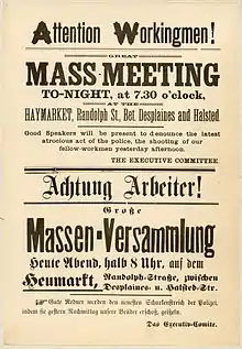 Outraged by this act of police violence, local anarchists quickly printed and distributed fliers calling for a rally the following day at Haymarket Square (also called the Haymarket), which was then a bustling commercial center near the corner of Randolph Street and Desplaines Street. Printed in German and English, the fliers stated that the police had murdered the strikers on behalf of business interests and urged workers to seek justice. The first batch of fliers contain the words Workingmen Arm Yourselves and Appear in Full Force! When Spies saw the line, he said he would not speak at the rally unless the words were removed from the flier. All but a few hundred of the fliers were destroyed, and new fliers were printed without the offending words;[31] more than 20,000 copies were distributed.[32]