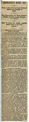 A New York Times article, with the dateline May 4, and headlined "Rioting and Bloodshed in the Streets of Chicago ... Twelve Policemen Dead or Dying", reported that Fielden spoke for 20 minutes, alleging that his words grew "wilder and more violent as he proceeded".[36] Another New York Times article, headlined "Anarchy's Red Hand" and dated May 6, opens with: "The villainous teachings of the Anarchists bore bloody fruit in Chicago tonight and before daylight at least a dozen stalwart men will have laid down their lives as a tribute to the doctrine of Herr Johann Most." It referred to the strikers as a "mob" and used quotation marks around the term "workingmen".[37]