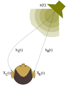 HRTFs for left and right ear (expressed above as HRIRs) describe the filtering of a sound source (x(t)) before it is perceived at the left and right ears as xL(t) and xR(t), respectively.