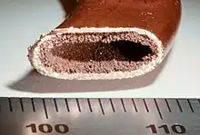 The first commercial heat pipe product was the "Thermal Magic Cooking Pin" developed by Energy Conversion Systems, Inc. and first sold in 1966.[45] The cooking pins used water as the working fluid. The envelope was stainless steel, with an inner copper layer for compatibility. During operation, one end of the heat pipe is poked through the roast. The other end extends into the oven where it draws heat to the middle of the roast. The high effective conductivity of the heat pipe reduces the cooking time for large pieces of meat by one-half.[46]