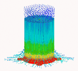 ![]() 38 mm diameter by 50 mm tall pin fin heat sink with thermal profile and swirling animated forced convection flow trajectories from a vaneaxial fan, predicted using a CFD analysis package |