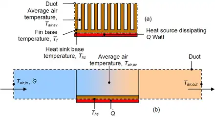 For a heat sink in a duct, where air flows through the duct, the heat-sink base will usually be hotter than the air flowing through the duct. Applying the conservation of energy, for steady-state conditions, and Newton's law of cooling to the temperature nodes shown in the diagram gives the following set of equations: