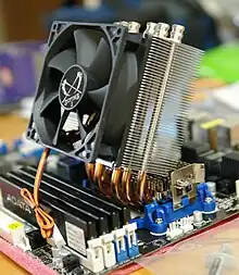 A heat sink (also commonly spelled heatsink,[1]) is a passive heat exchanger that transfers the heat generated by an electronic or a mechanical device to a fluid medium, often air or a liquid coolant, where it is dissipated away from the device, thereby allowing regulation of the device's temperature. In computers, heat sinks are used to cool CPUs, GPUs, and some chipsets and RAM modules. Heat sinks are used with other high-power semiconductor devices such as power transistors and optoelectronics such as lasers and light-emitting diodes (LEDs), where the heat dissipation ability of the component itself is insufficient to moderate its temperature.