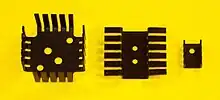 The materials for heat sink applications should have high heat capacity and thermal conductivity in order to absorb more heat energy without shifting towards a very high temperature and transmit it to the environment for efficient cooling.[5] The most common heat sink materials are aluminium alloys.[6] Aluminium alloy 1050 has one of the higher thermal conductivity values at 229 W/(m·K) and heat capacity of 922 J/(kg·K),[7] but is mechanically soft. Aluminium alloys 6060 (low-stress), 6061, and 6063 are commonly used, with thermal conductivity values of 166 and 201 W/(m·K) respectively. The values depend on the temper of the alloy. One-piece aluminium heat sinks can be made by extrusion, casting, skiving or milling.