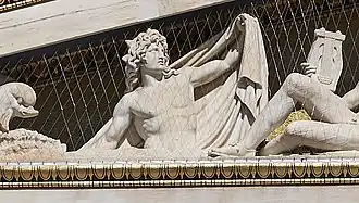 Helios was envisioned as a god driving his chariot from east to west each day, pulled by four white horses. In the ancient world people were not too troubled over how his chariot flew through the sky, as they did not envision the Earth as a spherical object, so Helios would not be travelling around a globe in an orbit; rather he crossed the sky from east to west each morning in a linear direction.[59] The chariot and his horses are mentioned by neither Homer nor Hesiod, the earliest work in which they are attested being the Homeric Hymn to Helios.[60][61][53] Although the chariot is usually said to be the work of Hephaestus,[62][63] Hyginus states that it was Helios himself who built it.[64] In one Greek vase painting, Helios appears riding across the sea in the cup of the Delphic tripod which appears to be a solar reference. His chariot is described as golden[48] or pink[65] in colour. The Horae, goddesses of the seasons, are part of his retinue and help him yoke his chariot.[66][67][68] His sister Eos is said to have not only opened the gates for Helios, but would often accompany him as well in his daily swing across the skies.[69] Every day he rose from the Ocean, the great earth-encircling river, carried by his horses: