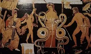 In Euripides' lost play Phaethon, surviving only in twelve fragments, Phaethon is the product of an illicit liaison between his mother Clymene (who is now married to Merops, the king of Aethiopia) and Helios, though she claimed that her lawful husband was the father of her all her children.[118][119] Clymene reveals the truth to her son, and urges him to travel east to get confirmation from his father after she informs him that Helios promised to grant their child any wish when he slept with her. Although reluctant at first, Phaethon is convinced and sets on to find his birth father.[120] In a surviving fragment from the play, Helios accompanies his son in his ill-fated journey in the skies, trying to give him instructions on how to drive the chariot while he rides on a spare horse named Sirius,[121] as someone, perhaps a paedagogus informs Clymene of Phaethon's fate, who is probably accompanied by slave women: