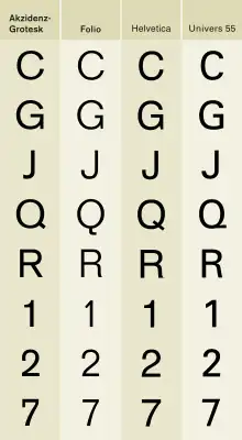 Helvetica Textbook is an alternate design of the typeface, which uses 'schoolbook' stylistic alternates to increase distinguishability: a seriffed capital 'i' and 'j' to increase distinguishability, a 'q' with a flick upwards and other differences, such as the digits '1' and '4' similar to how handwritten digits are. The letters 'a', 't', 'u', and the digits '6' and '9' are replaced with designs similar to those in geometric sans-serifs such as those found in Futura, Akzidenz-Grotesk Schulbuch, and Avant Garde (except for 'u').[68] FontShop's FF Schulbuch is similar.[69][70]