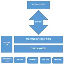 Applications that are run on Heroku typically have a unique domain used to route HTTP requests to the correct application container[20] or dyno.[21] Each of the dynos are spread across a "dyno grid" which consists of several servers. Heroku's Git server handles application repository pushes from permitted users.[22]