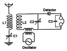 In 1901, Reginald Fessenden demonstrated a direct-conversion heterodyne receiver or beat receiver as a method of making continuous wave radiotelegraphy signals audible.[7] Fessenden's receiver did not see much application because of its local oscillator's stability problem. A stable yet inexpensive local oscillator was not available until Lee de Forest invented the triode vacuum tube oscillator.[8] In a 1905 patent, Fessenden stated that the frequency stability of his local oscillator was one part per thousand.[9]