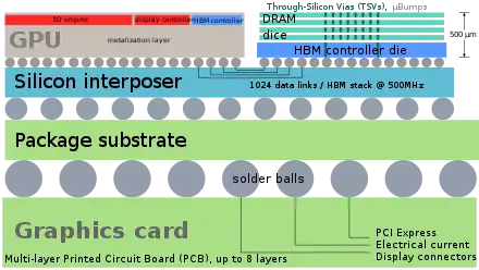 HBM achieves higher bandwidth than DDR4 or GDDR5 while using less power, and in a substantially smaller form factor.[8] This is achieved by stacking up to eight DRAM dies and an optional base die which can include buffer circuitry and test logic.[9] The stack is often connected to the memory controller on a GPU or CPU through a substrate, such as a silicon interposer.[10][11] Alternatively, the memory die could be stacked directly on the CPU or GPU chip. Within the stack the dies are vertically interconnected by through-silicon vias (TSVs) and microbumps. The HBM technology is similar in principle but incompatible with the Hybrid Memory Cube (HMC) interface developed by Micron Technology.[12]
