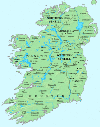 Eoin MacNeill identified the "oldest certain fact in the political history of Ireland" as the existence in late prehistory of a pentarchy, probably consisting of the cóiceda or "fifths" of the Ulaid (Ulster), the Connachta (Connacht), the Laigin (Leinster), Mumu (Munster) and Mide (Meath), although some accounts discount Mide and split Mumu in two.[7] This is not an accurate description of the political landscape c. 800,[8][note 2] but when discussing the political subdivisions of Ireland at this time, it is still useful to refer to this system; if Laigin and Mide are combined as Leinster, it roughly corresponds with the modern four provinces of Ireland.
