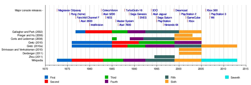 The exact start and end of each console generation is not consistently defined. Some schemes have been based on direct market data (including a seminal work published in an IEEE journal in 2002),[29] while others are based on shifts in technology. Wikipedia itself has been noted for creating its own version of the console generations that differ from academic sources.[24] The discrepancies between how consoles are grouped into generations and how these generations are named have caused confusion when trying to compare shifts in the video game marketplace compared to other consumer markets.[24] Kemerer et al. (2017)[24] provide a comparative analysis of these different generations through systems released up to 2010 as shown below.
