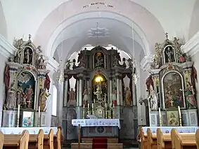 The local church is dedicated to Saint Nicholas and belongs to the Parish of Vrh Svetih Treh Kraljev.[5] In 973 the church belonged to the Diocese of Freising.[4] The current building dates from the beginning of the 16th century[6] and obtained its current appearance during a Baroque remodeling in the 18th century and is surrounded by a small cemetery.[4] It has an entryway through a belfry with four double-lancet windows, a rectangular nave, and a low, narrow chancel. The interior is richly decorated and contains a stone floor and a crypt.[6]
