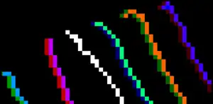 The final form of Hold-And-Modify was, hardware-wise, functionally the same as the original HSV concept, but instead of operating on those three descriptive components (mostly prioritising the V component), it modifies one of the three RGB color channels. HAM can be considered a lossy compression technique, similar in operation and efficiency to JPEG minus the DCT stage; in HAM6 mode, an effective 4096-color (12-bit) playfield is encoded in half the memory that would normally be required - and HAM8 reduces this still further, to roughly 40%. There is a however a payoff for this simplistic compression: a greater overall color fidelity is achieved at the expense of horizontal artifacts, caused by the inability to set any single pixel to an arbitrary 12- (or 18, 24) bit value. At the extreme, it can take three pixels to change from one color to another, reducing the effective resolution at that point from a "320-pixel" to approximately "106-pixel" mode, and causing smears and shadows to spread along a scanline to the right of a high contrast feature if the 16 available palette registers prove insufficient.
