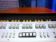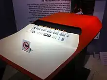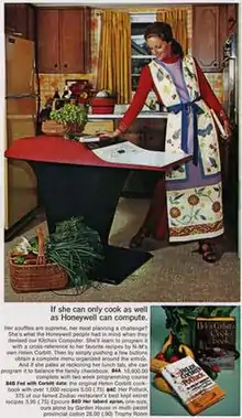 The Honeywell Kitchen Computer was a special offering of the H316 pedestal model by Neiman Marcus in 1969 as one of a continuing series of extravagant gift ideas.[18] It was offered for US$10,000[19] (equivalent to US$83,000 in 2023), weighed over 100 pounds (over 45 kg) and was advertised as useful for storing recipes. The imagined uses of the Honeywell Kitchen Computer also included assistance with meal planning and balancing the family checkbook – the marketing of which included highly traditional and patronizing representations of housewives.[20] Reading or entering these recipes would have been nearly impossible for the average intended user, since the user interface required the user to complete a two-week course just to learn how to program the device, using only toggle-switch input and binary-light output. To round out the domestic marketing, the pedestal model's writing surface was rebranded as a built-in cutting board and the computer would have a few recipes built in. No evidence has been found that any Honeywell Kitchen Computers were ever sold, though Honeywell did sell a small number (less than 20) pedestal computers outside of the Neiman Marcus branding.[21][22]
