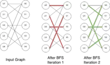 The algorithm was discovered by John Hopcroft and Richard Karp (1973) and independently by Alexander Karzanov (1973).[3] As in previous methods for matching such as the Hungarian algorithm and the work of Edmonds (1965), the Hopcroft–Karp algorithm repeatedly increases the size of a partial matching by finding augmenting paths. These paths are sequences of edges of the graph, which alternate between edges in the matching and edges out of the partial matching, and where the initial and final edge are not in the partial matching. Finding an augmenting path allows us to increment the size of the partial matching, by simply toggling the edges of the augmenting path (putting in the partial matching those that were not, and vice versa). Simpler algorithms for bipartite matching, such as the Ford–Fulkerson algorithm‚ find one augmenting path per iteration: the Hopcroft-Karp algorithm instead finds a maximal set of shortest augmenting paths, so as to ensure that only iterations are needed instead of iterations. The same performance of can be achieved to find maximum-cardinality matchings in arbitrary graphs, with the more complicated algorithm of Micali and Vazirani.[4]