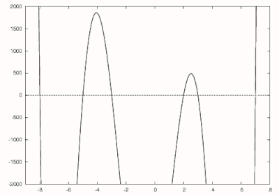 which is shown in blue and yields a zero of −5. The final root of the original polynomial may be found by either using the final zero as an initial guess for Newton's method, or by reducing and solving the linear equation. As can be seen, the expected roots of −8, −5, −3, 2, 3, and 7 were found.
