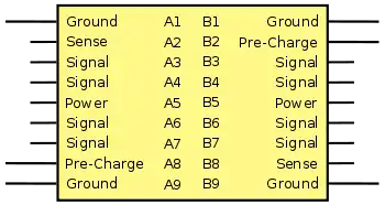 As long as the hot-swap connector is sufficiently rigid, one of the four corner pins will always be the first to engage. For a typical two-row connector arrangement this provides four first-to-make corner pins that are usually used for grounds. Other pins near the corners can be used for functions that would also benefit from this effect, for example sensing when the connector is fully seated. This diagram illustrates good practice where the grounds are in the corners and the power pins are near the center. Two sense pins are located in opposite corners so that fully seated detection is confirmed only when both of them are in contact with the slot. The remaining pins are used for all the other data signals.