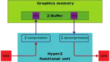 HyperZ is the brand for a set of processing techniques developed by ATI Technologies and later Advanced Micro Devices and implemented in their Radeon-GPUs. HyperZ was announced in November 2000[1] and was still available in the TeraScale-based Radeon HD 2000 Series[2][3] and in current Graphics Core Next-based graphics products.[4]