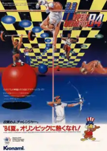 Hyper Sports, known in Japan as Hyper Olympic '84,[4] is an Olympic-themed sports video game released by Konami for arcades in 1984. It is the sequel to 1983's Track & Field and features seven new Olympic events. Like its predecessor, Hyper Sports has two run buttons and one action button per player. The Japanese release of the game sported an official license for the 1984 Summer Olympics.