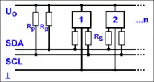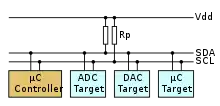I2C uses only two signals: serial data line (SDA) and serial clock line (SCL). Both are bidirectional and pulled up with resistors.[3] Typical voltages used are +5 V or +3.3 V, although systems with other voltages are permitted.