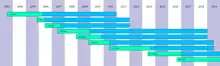 The different SAN Volume Controller models were available for purchase shortly after the mentioned announcement day. The light green bars show the period of time when each model could be ordered, while the light blue bars show how long the standard service was continued after withdrawal from marketing. The displayed information is current in August 2019. There are differences in service conditions between 2145 and 2147, but not in hardware.