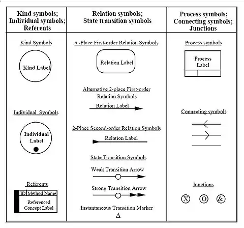 Some of the key terms in IDEF5 and the basic IDEF5 Schematic Language Symbols, see figure.:[1]