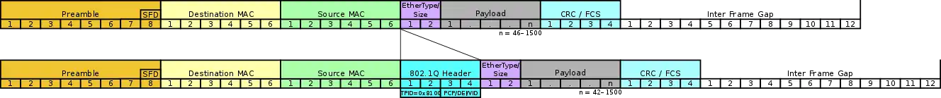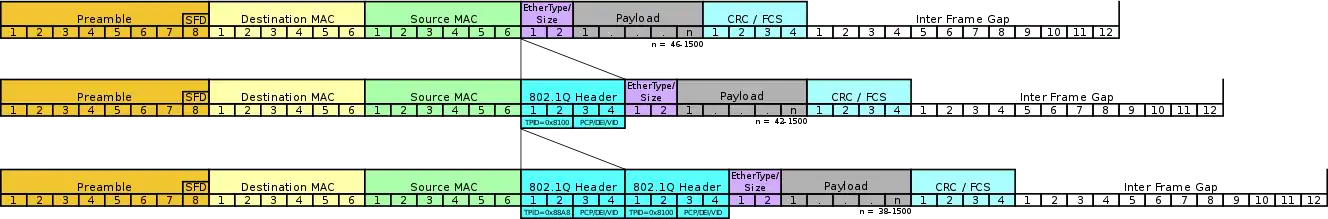 802.1Q adds a 32-bit field between the source MAC address and the EtherType fields of the original frame. Under 802.1Q, the maximum frame size is extended from 1,518 bytes to 1,522 bytes. The minimum frame size remains 64 bytes, but a bridge may extend the minimum size frame from 64 to 68 bytes on transmission. This allows a tag to be popped without needing additional padding.[2][3] Two bytes are used for the tag protocol identifier (TPID), the other two bytes for tag control information (TCI). The TCI field is further divided into PCP, DEI, and VID.[4]