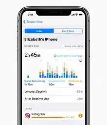 Screen Time is a new feature in iOS 12 that records the amount of time a user spent on the device. The feature also displays the amount of time the user used particular apps,[8] the amount of time the user used particular categories of apps (such as games),[9] and the number of notifications the user received.[10]