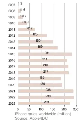 - ↑ "iPhone-Verkaufszahlen weltweit bis 2023". Statista (in German). Archived from the original on November 14, 2023. Retrieved November 14, 2023.