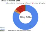 The iPhone 11 Pro has a carbon footprint of 80 kilograms (180 lb) CO2e emissions, which is 10 kilograms (22 lb) more than the preceding iPhone XS and 25 kilograms (55 lb) more than the iPhone 3G in 2008.[41] 83% of the emissions are caused by the production of the device and primary resources while remaining emissions are caused by transportation and first use. [42][43]