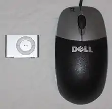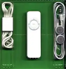 The third-generation iPod Shuffle featured a polished steel attachment clip, adopting for the first time the polished steel finishing previously found only on the larger iPods, rather than the brushed aluminum used in the second-generation iPod Shuffle. It also no longer had volume or track controls on the device itself. Instead, the packaged iPod earbuds included a three-button device on the right earbud cord. This added the functions of changing between playlists, hearing the song title and artist of the track playing, as well as play/pause, track changes and volume control.[16] It originally was not possible to change songs or volume with most third-party headphones, since they lacked these controls. However, since the device began playing music automatically when it was turned on, third-party headphones could still be used in "autoplay" mode (with no volume or playback controls), and after its release, some third-party headphones and headphone adapters began to include full support for the third generation.[17] The official headphones contained a chip designed by Apple to control the device. DRM is not however present in the chip as there is no encryption used.[18]