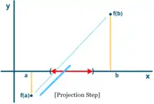 The ITP method follows the same structure of standard bracketing strategies that keeps track of upper and lower bounds for the location of the root; but it also keeps track of the region where worst-case performance is kept upper-bounded. As a bracketing strategy, in each iteration the ITP queries the value of the function on one point and discards the part of the interval between two points where the function value shares the same sign. The queried point is calculated with three steps: it interpolates finding the regula falsi estimate, then it perturbes/truncates the estimate (similar to Regula falsi § Improvements in regula falsi) and then projects the perturbed estimate onto an interval in the neighbourhood of the bisection midpoint. The neighbourhood around the bisection point is calculated in each iteration in order to guarantee minmax optimality (Theorem 2.1 of [3]). The method depends on three hyper-parameters and where is the golden ratio : the first two control the size of the truncation and the third is a slack variable that controls the size of the interval for the projection step.[lower-alpha 1]
