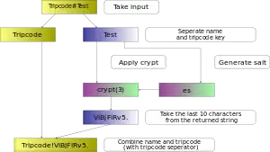 Due to the fact tripcodes can be cracked given enough time, some imageboards, such as 4chan and 8chan, implement a "secure" tripcode.[3] Such tripcodes are not reproducible across different imageboards; they work by prepending a secure salt to the tripcode, barring intrusion, known only to the server owner.[3] They therefore function closer to a username than to a cryptographic signature; this is why QAnon could not verify themselves on another website when 8chan went down in late 2019.[4][5][6]