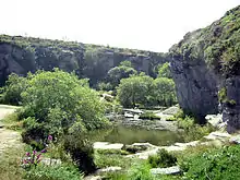 The extensive quarries at Foggintor provided granite for the construction of London's Nelson's Column in the early 1840s, and New Scotland Yard was faced with granite from the quarry at Merrivale.[2] Merrivale Quarry continued excavating and working its own granite until the 1970s, producing gravestones and agricultural rollers. Work at Merrivale continued until the 1990s, for the last 20 years imported stone such as gabbro from Norway and Italian marble was dressed and polished.[3] The unusual pink granite at Great Trowlesworthy Tor was also quarried, and there were many other small granite quarries dotted around the moor. Various metamorphic rocks were also quarried in the metamorphic aureole around the edge of the moor, most notably at Meldon.[4]